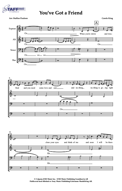 Carole King’s odödliga hit i ett medelsvårt fyrstämmigt arr. En riktig pärla i repertoaren! Finns i flera olika sättningar.
